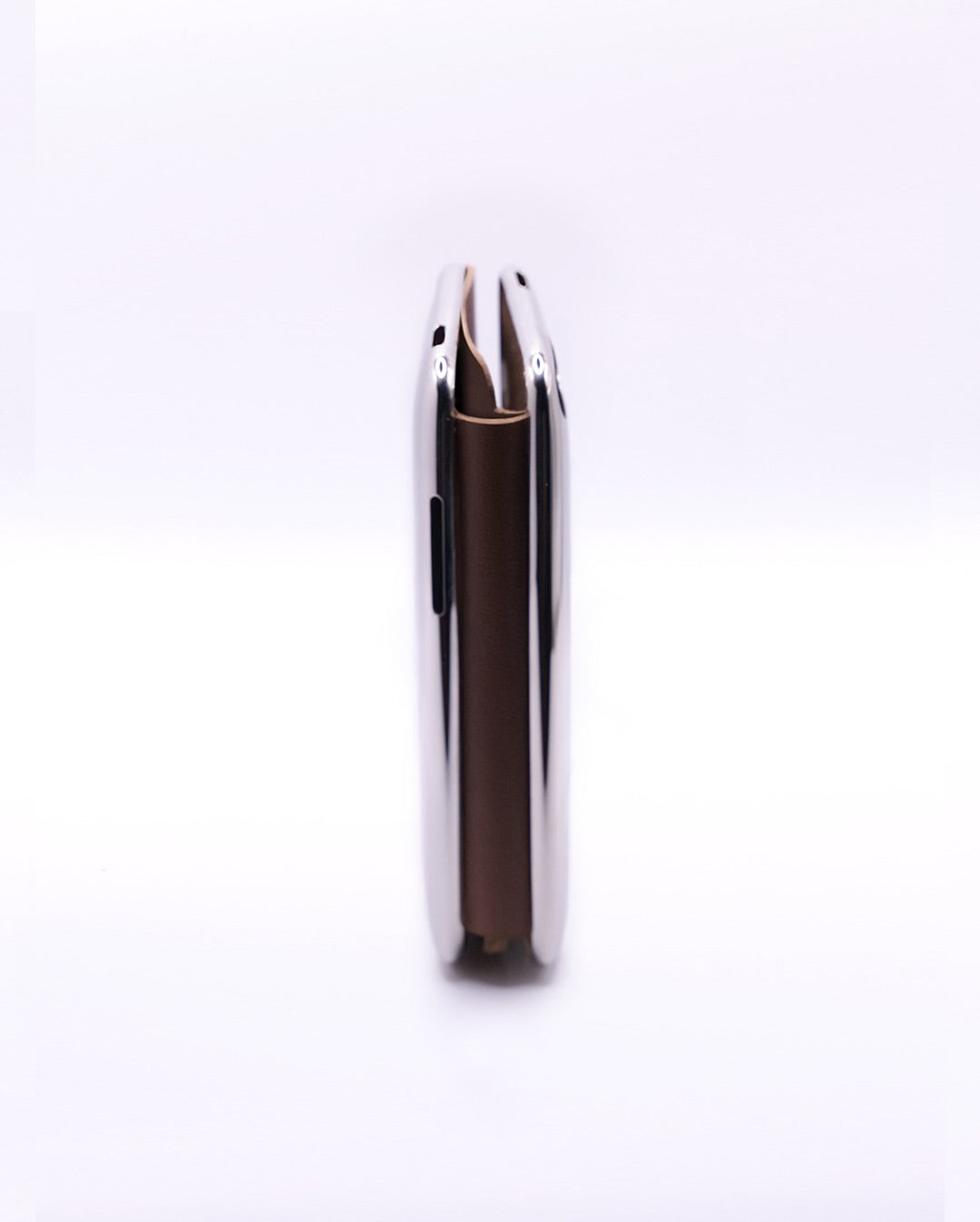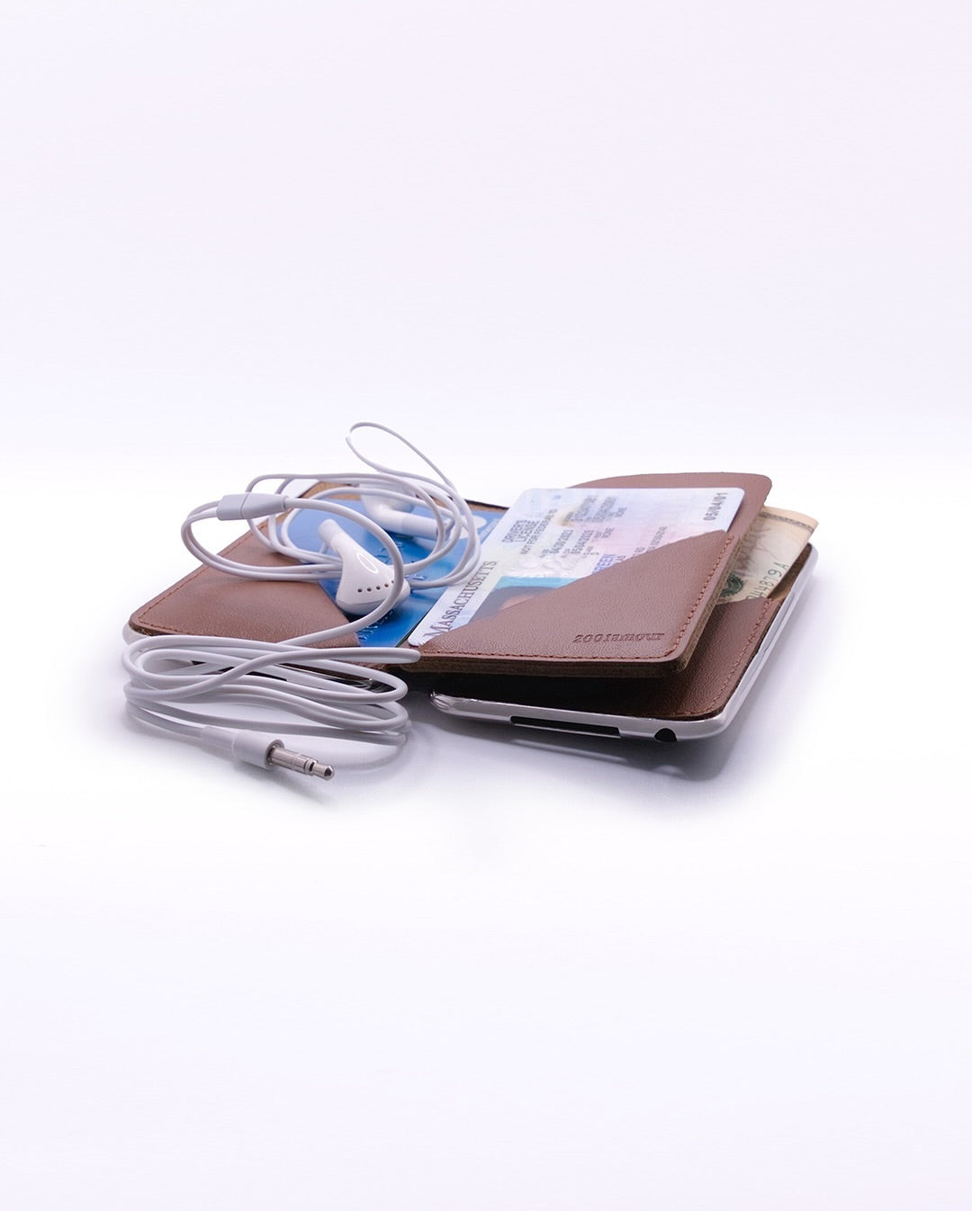 A card wallet built inside a repurposed iPod Touch 2G shell. The original aluminum casing houses a leather card sleeve, holding up to 4 cards and folded cash.